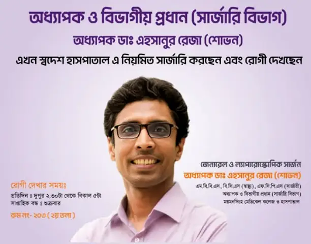ডাঃ এহসানুর রেজা (শোভন) শুধু একজন সার্জন নন, তিনি ময়মনসিংহের সার্জারি বিভাগের একটি শক্তিশালী স্তম্ভ। তার FCPS যোগ্যতা, অধ্যাপক পদ এবং ল্যাপারোস্কপিক দক্ষতা তাকে অনন্য করে তুলেছে। যাদের অ্যাপেন্ডিসাইটিস, হার্নিয়া, গলব্লাডার সমস্যা বা অন্য কোনো সার্জিক্যাল সমস্যা রয়েছে—তারা তার কাছে আসতে পারেন।