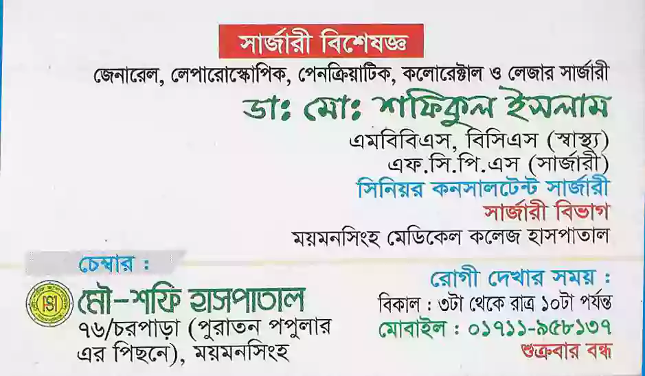 মৌ-শফি হাসপাতাল ৭৬/চরপাড়া (পুরাতন পপুলার এর পিছনে), ময়মনসিংহ
