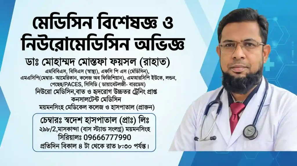 ময়মনসিংহ অঞ্চলে একজন দক্ষ, অভিজ্ঞ ও আন্তর্জাতিক মানের মেডিসিন বিশেষজ্ঞ খুঁজে পাওয়া সবসময় সহজ নয়। দীর্ঘদিনের অভিজ্ঞতা, উচ্চতর প্রশিক্ষণ এবং রোগী-কেন্দ্রিক চিকিৎসা দর্শনের কারণে ডাঃ মোহাম্মদ মোস্তফা ফয়সাল রাহাত আজ ময়মনসিংহের মানুষের কাছে একটি নির্ভরতার নাম। সাধারণ জ্বর থেকে শুরু করে জটিল ডায়াবেটিস, হৃদরোগ, নিউরো মেডিসিন ও বাতজনিত সমস্যার চিকিৎসায় তিনি সমানভাবে পারদর্শী।